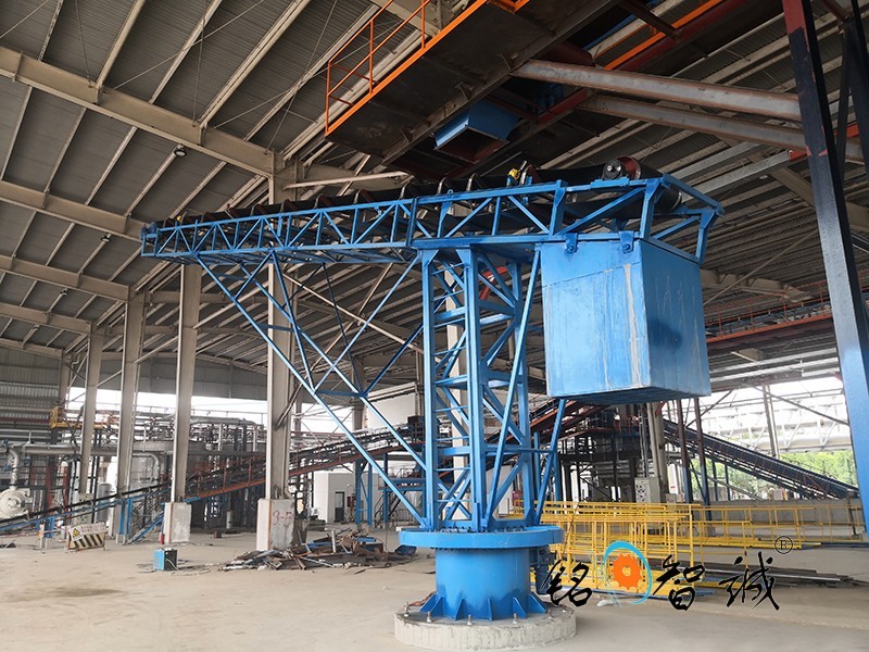 旋轉(zhuǎn)式皮帶輸送機,為散碎物料倉貯輸送設(shè)備,是在安裝有行走輪的支架上部的底盤上安裝一轉(zhuǎn)盤,轉(zhuǎn)盤可相對底盤作旋轉(zhuǎn)運動,皮帶輸送機的進料端座在轉(zhuǎn)盤頂部的托盤上,出料端為懸臂式,配重箱在托盤上用以上與懸臂配重,倉貯時,物料通過料斗由輸送帶送至遠端,推動懸臂即可改變堆積位置,在庫房內(nèi)實現(xiàn)多點堆積而勿需停機和移動機體,連續(xù)作業(yè)省時省力,操作方便,尤其適用于糧食的倉貯輸送。